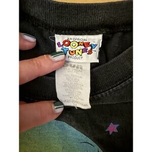 This Vintage 90's Black Sun Sportswear WB Tweety Bird Cropped Tweet T-Shirt in size XL is a women's clothing item made of 100% cotton. The colorful tweety bird design, crew neck, and relaxed fit give it a retro and nostalgic appeal. Perfect for fans of Looney Tunes, USA, and 90s fashion, this t-shirt embodies the iconic style of the era. Made in the United States, this cropped tee is a unique addition to any wardrobe, especially for those who appreciate vintage apparel.
