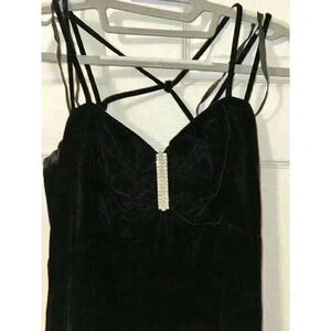 Vintage 90s Black Velour Velvet Spaghetti Strap Maxi Dress Jewel Detail ILGWU