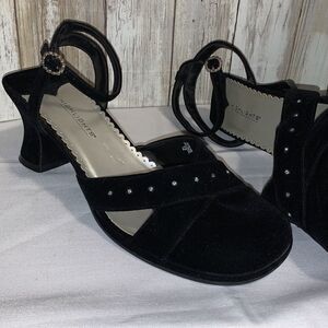 Velvet roomy square rounded toe with curvy chunky block heel. Buckle ankle straps. Dainty embellished faux Diamond stud trim. Small cut out side detail. Women’s size 9. Great vintage condition. Minor faint scuffs and nicks. Minimal faux leather cracking on underneath straps, not actively peeling. Adorable 90’s soft grunge.