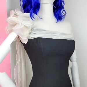 Vintage 90s black & white elegant one shoulder gown by Nadine. Features a white sheer organza ruffled should piece with hanging sash and rhinestone detail. Bodice has supportive boning on the inside. Tagged size 5/6. Best fit size XS/S. Mannequin measures B 34 / W 25 / H 35. Please see measurements for details. PM me if you have any questions.