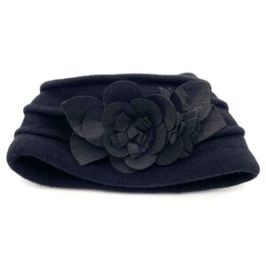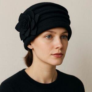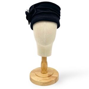 A classic black wool cloche with beautiful vintage details. This style features a softly ruched layered crown and a dimensional felt flower on the side, giving it that timeless 1920s–1950s dress hat feel. Made from soft, warm 100% wool—perfect for winter, holiday outfits, or adding a polished touch to everyday cold-weather looks.