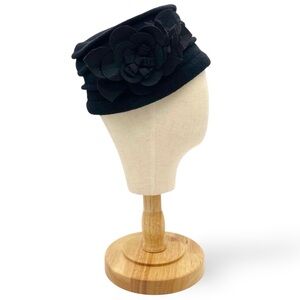 Vintage 90s Black Wool Cloche Hat Flower Accent 100% Wool Winter Dressy Travel