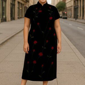 Vintage 90s Black and Red Floral Velour Midi Dress w/ Mandarin Collar - Size 10