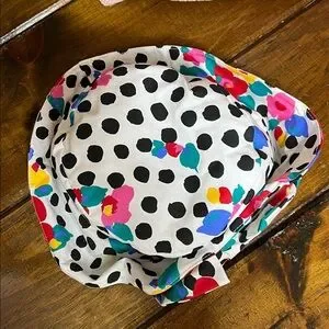 Vibrant hat with black polka dots and colorful floral accents. Perfect for adding a pop of color to any outfit. Comes from a smoke free environment.