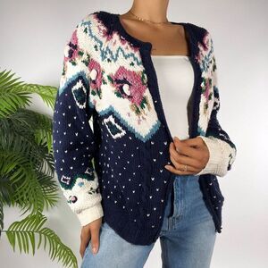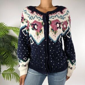 Vintage 90s Blue Floral Cottagecore Soft Girl Grandma Knit Sweater Cardigan / M