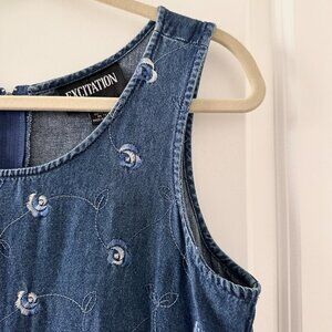 The cutest vintage 90s sleeveless blue denim long jumper dress with embroidered flowers on the chest. Scoop neck, back zipper, side split hems. Perfect for fall and back to school - looks great layered or worn with a tee or long sleeve shirt underneath.