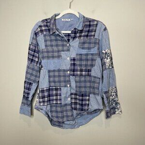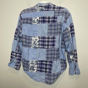 Vintage 90s Blue Plaid Floral Patchwork Button Down Blouse Size Medium.