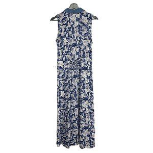 Vintage 90s Blue White Sleeveless Flora Collared Button Up Full Length Dress Lar