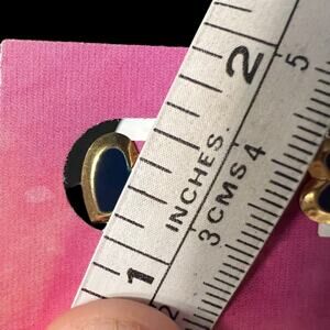 These vintage post earrings feature a classic heart shape design with a vibrant blue enamel center and a polished gold-tone metal frame. Based on the measurements visible in the photographs, each earring measures approximately 0.75 inches in diameter.