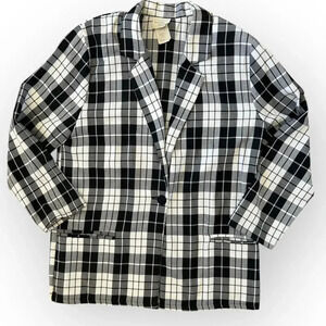 Vintage 90s Bobbie Brooks Light Black Cream Tartan Plaid Oversized Blazer 12/14
