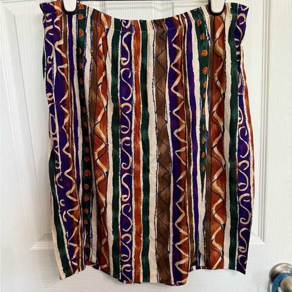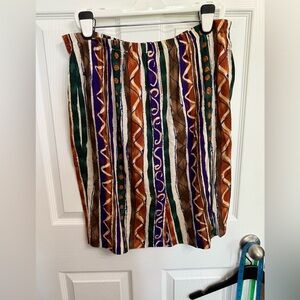 Super fun and funky vintage skirt featuring bold abstract tribal-style stripes in earthy tones—rust orange, forest green, deep purple, and cream. Elastic waistband makes it a comfy and flattering fit. Lightweight and flowy fabric, perfect for summer or layering in fall. Pair it with a crop top or oversized tee for a cool retro vibe. In great vintage condition with only flaw being small hole near waistband. See photo. Doesn’t affect fit at all.
