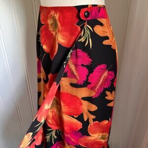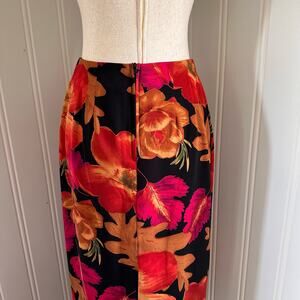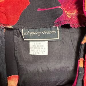 This 90s Intriguing Threads maxi skirt is a size 4. Its black with an orange, green, brown, and pink floral pattern. it has a zipper closure, is polyester and dry clean only. This piece has boho vibes and is in good vintage condition.