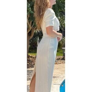 Step back in time with this gorgeous vintage 90's Brioche midi dress! This dress features a flattering curve-hugging design in a beautiful off-white color. Perfect for a special occasion or a chic everyday look.