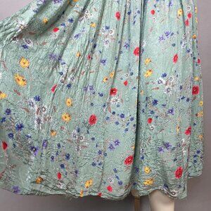 Vintage 90s Requirements broomstick skirt in a textured wildflower print fabric. Midi length, elastic waistband, pull-on style. Pale greenish with pops of colorful flowers.