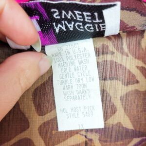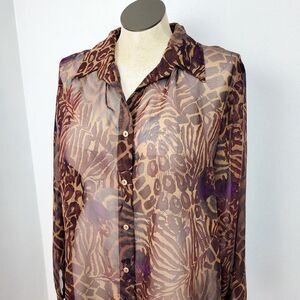Vintage 90s brown tone sheer animal print blouse by Maggie Sweet. Long flowy tunic style top. Mixed animal and floral print. Great condition. Tagged size 1X. Mannequin measures B 40 / W 32 / H 43 (size L). Please see measurements for details. PM me if you have any questions.
