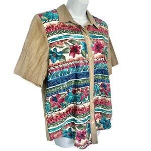 Vintage 90s Brown Floral Striped Short Sleeve Collared Button Down Shirt size M