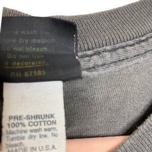 Vintage 90s Budweiser frogs Your Pad or Mine beer tee. Single stitch dark gray tee with frog graphics and lime green lettering on front, with multicolor brand logo and yellow lettering on back. Licensed in 1995 by Anheuser-Busch to Changes. On vintage Changes tag. Made in USA of 100% cotton.