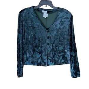 Step into 1990s elegance with this vintage Rabbit, Rabbit, Rabbit Designs velvet maxi dress and jacket set. Made in Korea, this two-piece ensemble is crafted from lush green stretch velvet with a subtle burnout floral pattern. The sleeveless maxi dress features a scoop neckline and ankle length silhouette, while the cropped jacket includes covered velvet buttons, structured shoulder pads, and long sleeves.