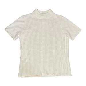 Step into classic 90s style with this vintage buttercream cable knit sweater by Designers Original. Featuring a mock neck, short sleeves, and a soft LuxeLon 100% acrylic fabric, this sweater offers a timeless, cozy feel with a structured yet comfortable fit. Perfect for layering or wearing on its own for a chic, retro-inspired look.