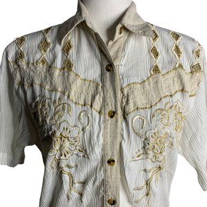 Vintage 90s Button Up Crinkle Blouse M White Short Sleeve Embroidered Cut Outs