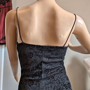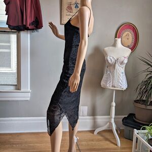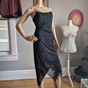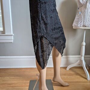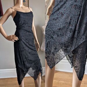 Vintage 1990s Byer Too! black midi dress. Black floral velvet detailing with red glitter throughout. Asymmetrical handkerchief hem. Sleeveless, spaghetti straps. Lined. Dress is in good vintage condition with light wear. This dress will leave glitter behind.