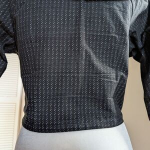 Vintage 1990s Cropped blazer jacket. Dark gray/black with dash pattern throughout. Tuxedo vest look. Double breasted. Oversized collar. Lined. Blazer is in good vintage condition with light fading.