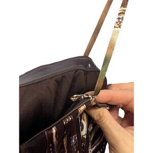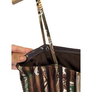 This vintage Cache dress from the 90s features a stylish A-line sheath silhouette with spaghetti straps, making it a sexy and elegant choice for parties and cocktail events. The dress is a size 8 and has a flattering midi length, perfect for a sophisticated look. Made of polyester material in a brown chocolate color with vertical patterned fabric striped accents.