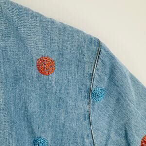 Vintage C.M.C. chambray denim shirt with playful multicolor embroidered dots in red and teal. Features short sleeves, button front, and a relaxed boxy fit. Timeless casual piece that pairs perfectly with jeans, shorts, or layered over a tee. Size Medium. In good pre-owned condition with light normal wear. Great addition for a retro, cottagecore, or casual vintage-inspired wardrobe.