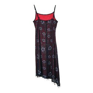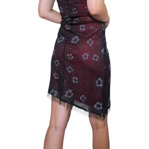 Red slip dress base with black floral mesh overlay. Floral is glittery sparkly with shades of black & gray. Gray sleeves, waist & tie in the back. Features; sleeveless spaghetti straps, scoop neckline, asymmetrical hem with beaded fringe, mini above knee length. Made in the USA. 100% polyester