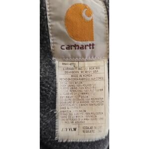 Features Full zip front, elastic cuffs and hem, dual zippered pockets, fleece-lined interior, rubber Carhartt patch logo, vintage Korean-made construction