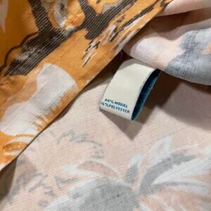 This is a high quality vintage 1990s button up short sleeve Hawaiian shirt featuring a print of a beautiful floral tropic landscape on a nice orange landscape. Perfect for summer or casual wear. Good condition.