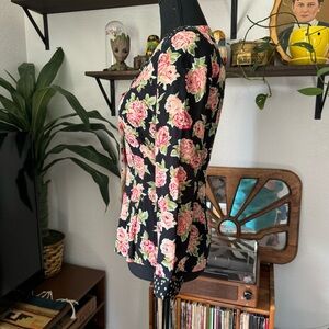 Vintage 90’s Carole Little Floral Beaded V-Neck Button Down Blouse size 4. Good vintage condition with no holes or damage. There are some white small spots that may be able to be treated & removed but aren’t noticeable when worn (see photo). Gorgeous beading adorns the collar, no missing beads. All buttons are intact & functional.