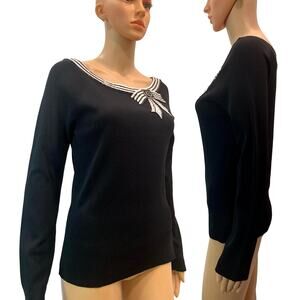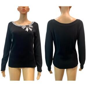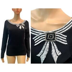 Vintage 90s Cartise Beaded Bow Sweater Black Knit Rhinestone L