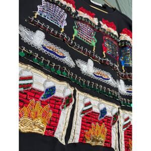 Incredible vintage holiday sweatshirt loaded with 3D appliqué, sequins, beading, and metallic embroidery. This Cedars piece is a true collectible — featuring rows of Santa hats, cozy armchairs, holiday dinners, and festive fireplaces. Each panel is embellished with multi-color beads, sequins, and textured appliqué.