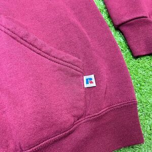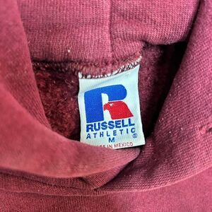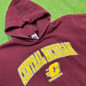 Vintage 90s Central Michigan Embroidered Hoodie is a cozy and nostalgic piece perfect for any NCAA or football enthusiast. Made of heavyweight cotton knit fabric in a burgundy color, this pullover hoodie features an embroidered logo and is machine washable. With a solid pattern, long sleeves, and hooded design, this hoodie offers a comfortable fit for men in size medium. Whether you're running, training, or just lounging in the 90s, this Russell Athletic hoodie is sure to add a touch of retro style to your wardrobe.