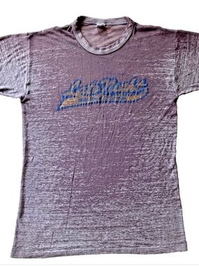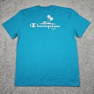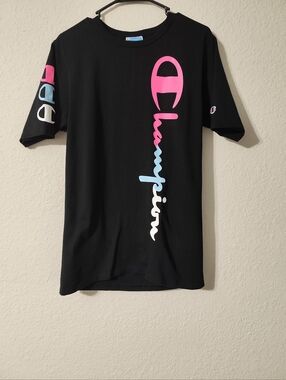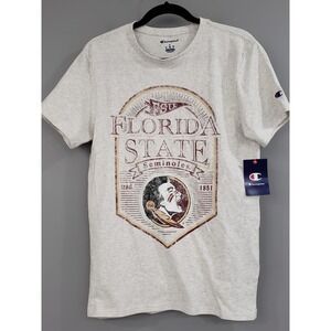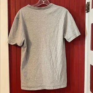 Classic gray tee with bold Champion logo. Features red and blue accents. Ideal for everyday wear.