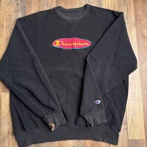 Vintage 90s Champion Sweatshirt Men's Large Black Embroidered Towel Crew Neck