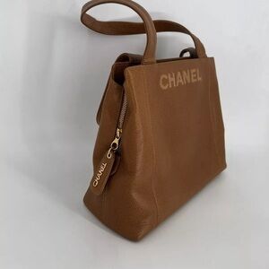 Brown caviar pebbled all over leather square shaped shoulder bag with Chanel stitched front embroidered logo. Chanel gold plated logo embellished zipper pull tab. Gold plated hardware. Has 3 slots with the center one being a zip closure pocket and the side ones open.has an interior zip pocket. In excellent condition with minimum signs of wear, only flaws are there is very minor wear to the corner of the bag. It looks like residue or dirt and can possibly be leather cleaned. No tears, stains or rips. Stunning bag.