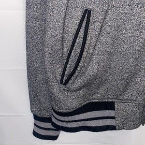 CHARLES AND A HALF Varsity Sweater Gray and Black varsity bomber. Salt and pepper, heather gray. Jersey material. Black snap up slant pockets with black piping closures 60% Cotton, 40% Polyester Small Measurements are approximately in inches Armpit to Armpit 20” Armpit to cuff 24.5” Length 26.5”
