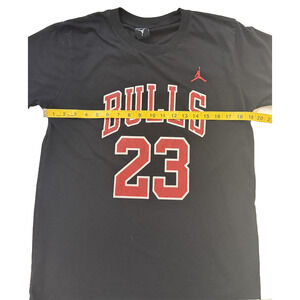 Front: Bold BULLS wordmark over large 23 in red/white with small Jumpman logo at right chest