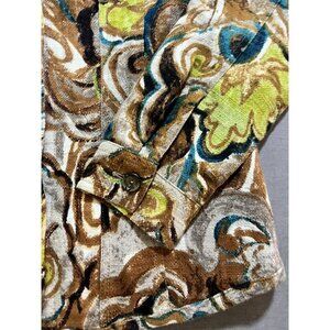 This vintage Chico's blazer jacket from the 90s is a must-have for any fashion-forward woman. The jacket features a beautiful floral pattern on a brown cotton outer shell, with a mid-length and long sleeves. It has a button closure, making it perfect for formal occasions, workwear, or business events.