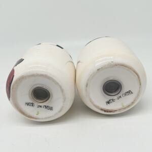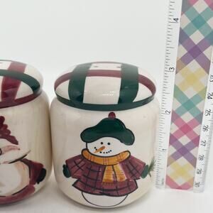 White ceramic salt and pepper shakers. Green and red graphic. Snowman on one shaker and Santa Claus on the other. Plaid design painted on top. Opens from bottom. Great condition.