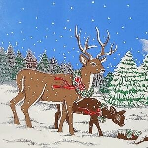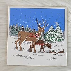 Vintage 90s Christmas Winter Snow Woods Scene Reindeer Deer Buck Cork Back Tile