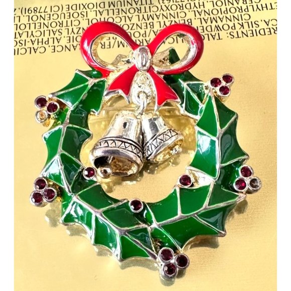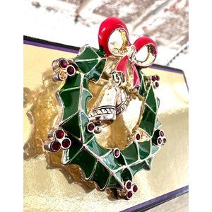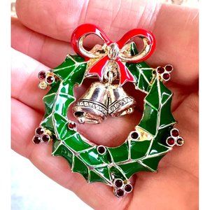Vintage 90's Christmas Wreath Pendant Pin Jingle Bells Crystal Accents O…