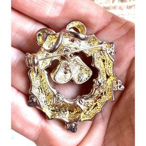 Vintage 90's Christmas Wreath Pendant Pin Jingle Bells Crystal Accents Open Cut Jewelry