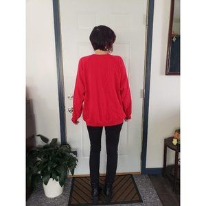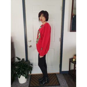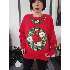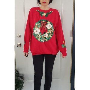 This crew neck is screaming Christmas and we love it. In very good condition, although the paint and designs do make it stiff in those areas. There is actually a piece of what I believe is the soft side of velcro attached to the inside of this shirt, and I believe the previous owner wore possibly a turtleneck underneath and velcroed the two together to get the wreath to lay more flatly.