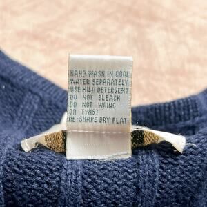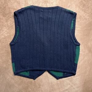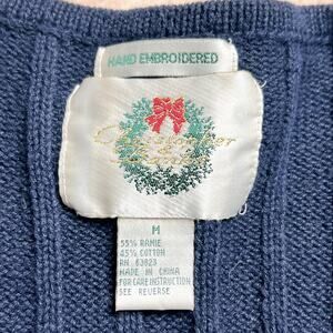 Navy. blue sweater with green and red holiday wreaths, hearts and flower print in a patchwork style layout. V neckline, button closure. Hand embroidered, vintage 1990s.