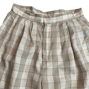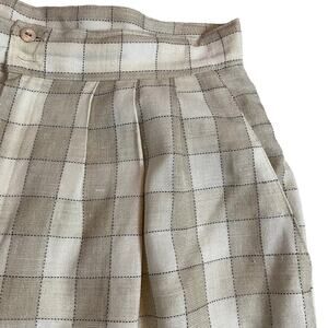 Good preowned condition, 85% viscose, 15% linen, high waist, pleated front, zipper and two button closure, no back pockets, cream and tan plaid