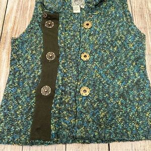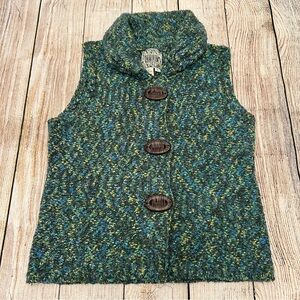 Chunky knit vest with a large collar and oversized buttons. Size small. See photos for exact measurements. Excellent condition. Next day shipping!
