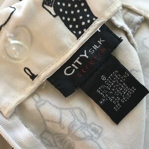 How fun is this 90s City Silk A-line skirt? Made in Hong Kong, it features the cutest all-over dress form print with subtle black pinstripe pleats — a true collectible for any fashion history fan or retro style queen.